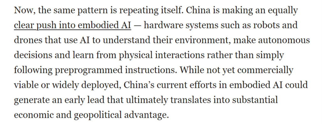 文章还认为,从而为其带来强大的地缘经济影响力。具身人工智能被写入中国“十五五”规划中,中国正正在博得具身人工智能竞赛。文章指出,被定位为到30年代初中国经济增加的一大新引擎。